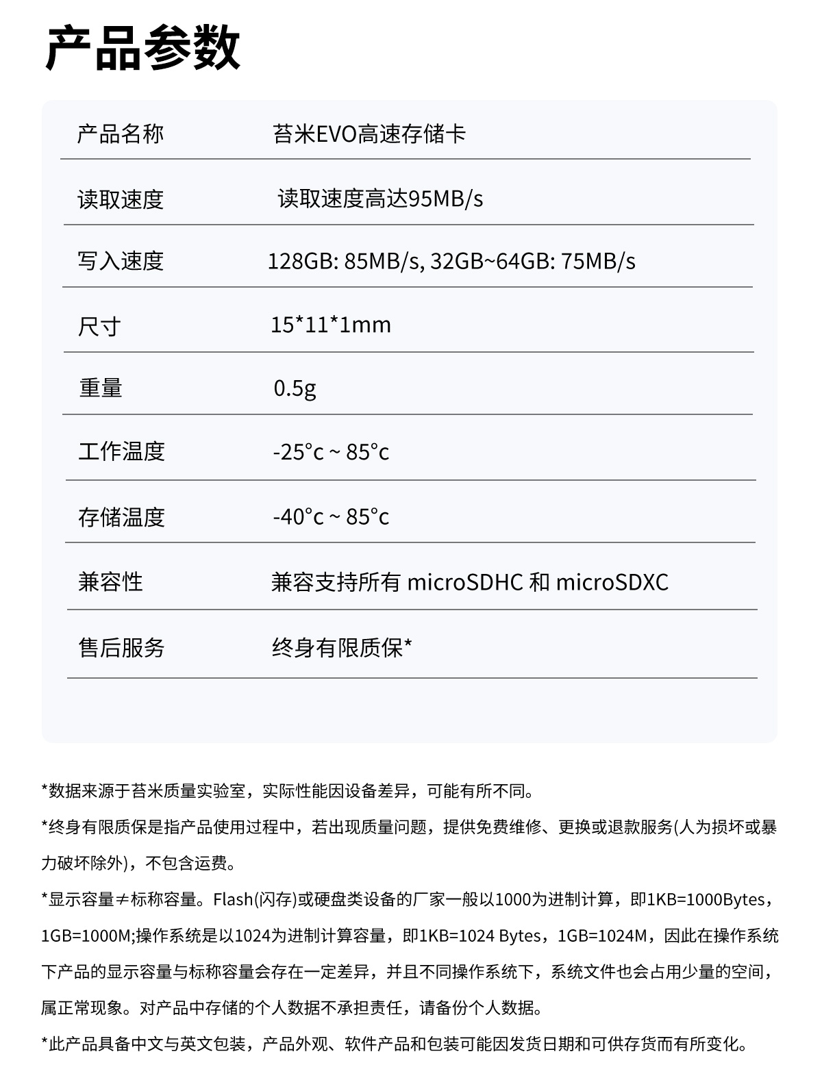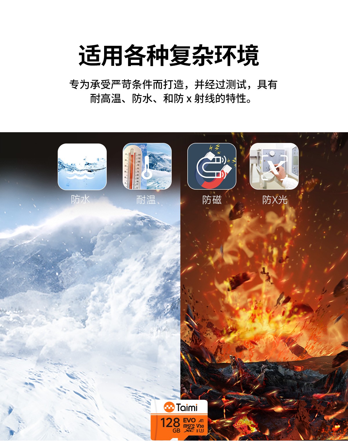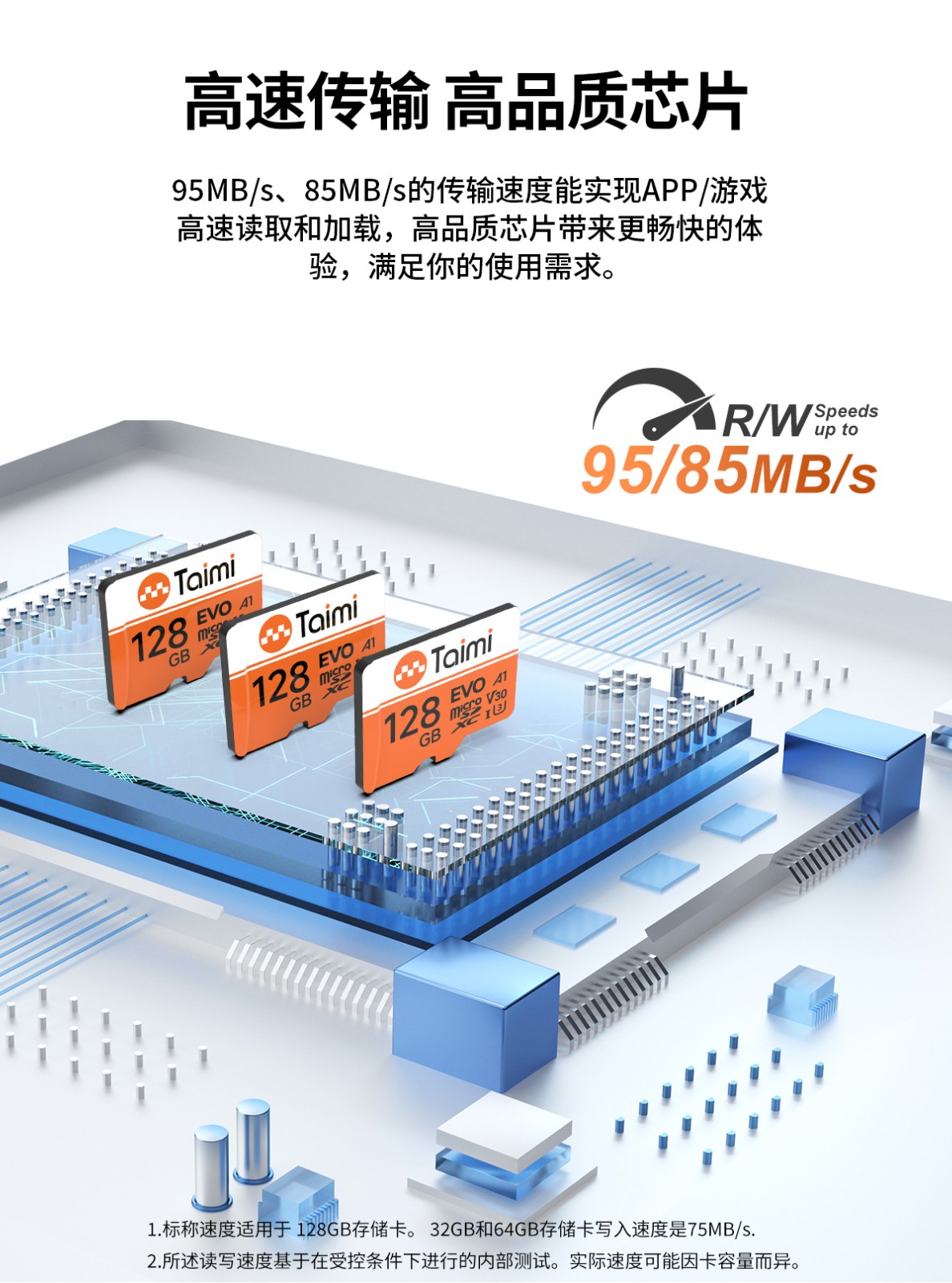 SD6.1协议,Toggle2.0标准,UHS-I,主机接口SDR104/DDR200/DDR225,LDPC纠错引擎,支持顺序读95MB/s ,顺序写75MB/s。便于快速存储4K超高清视频,A2性能水平轻松应对密集型APP,也能实现快速加载和多任务处理。