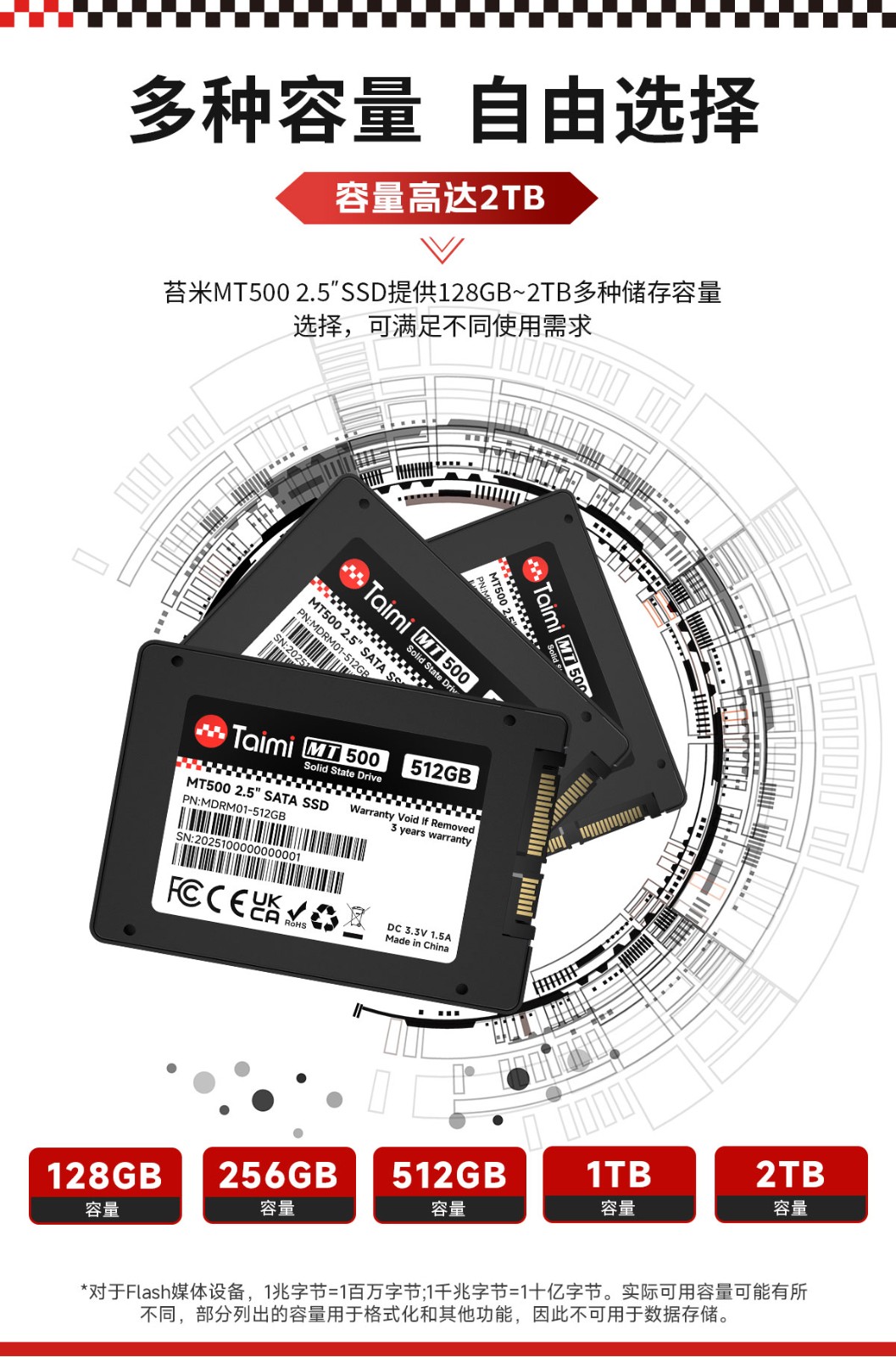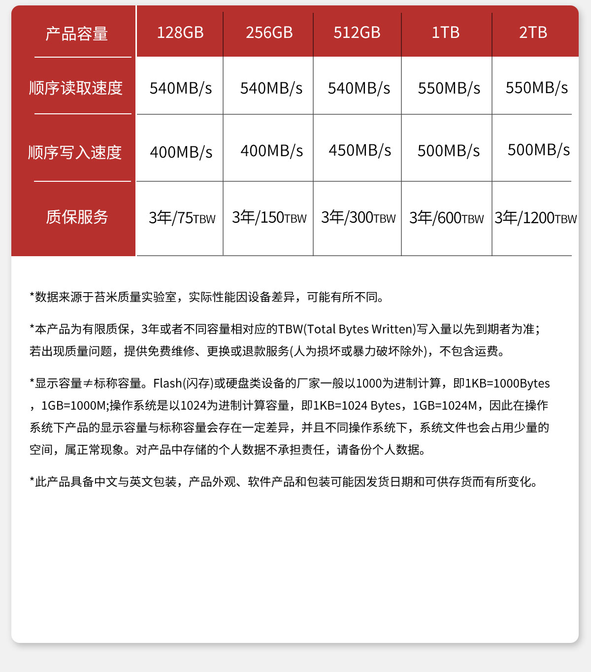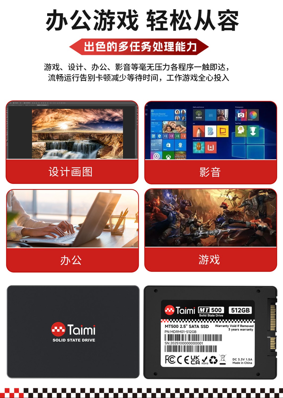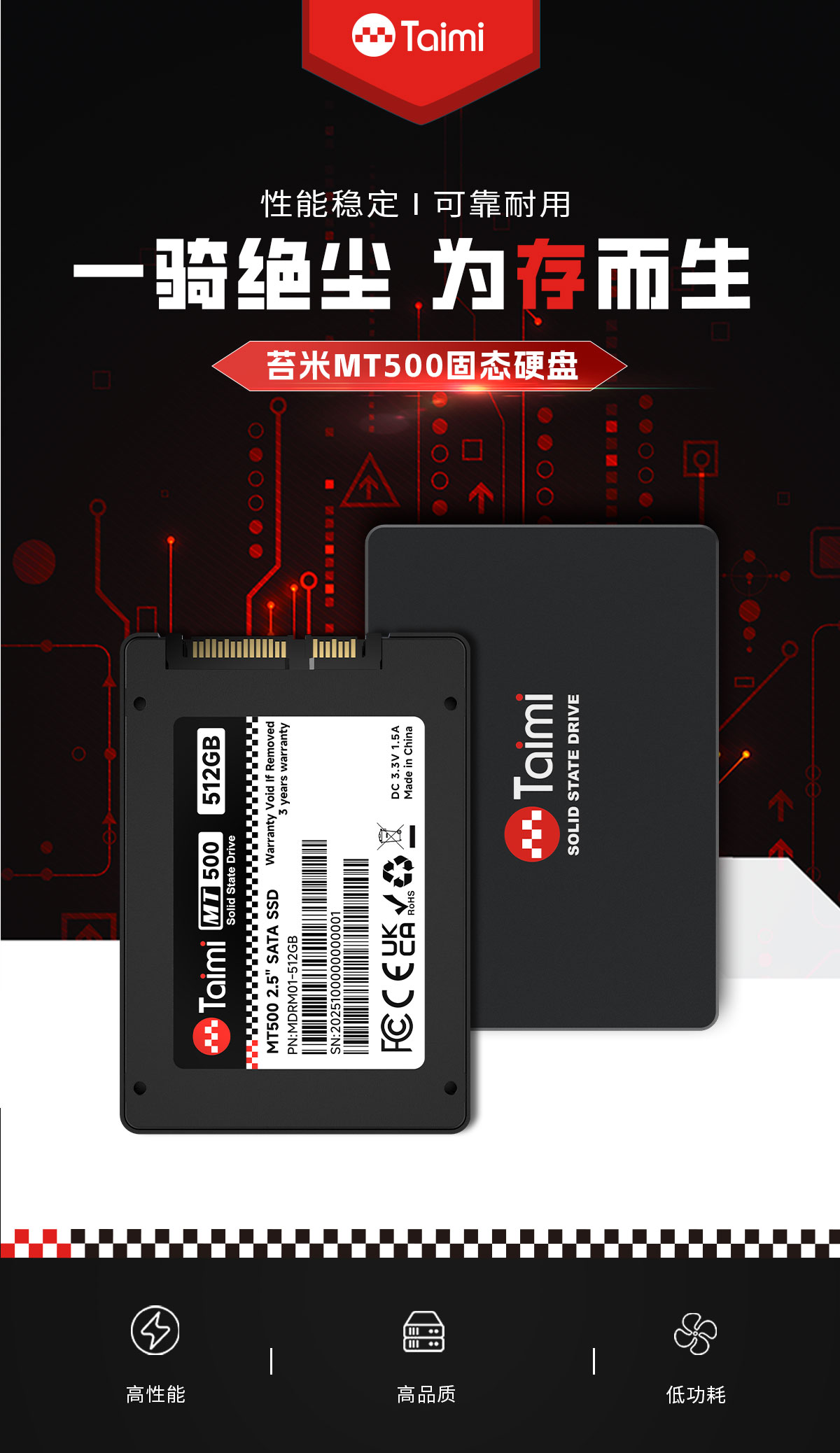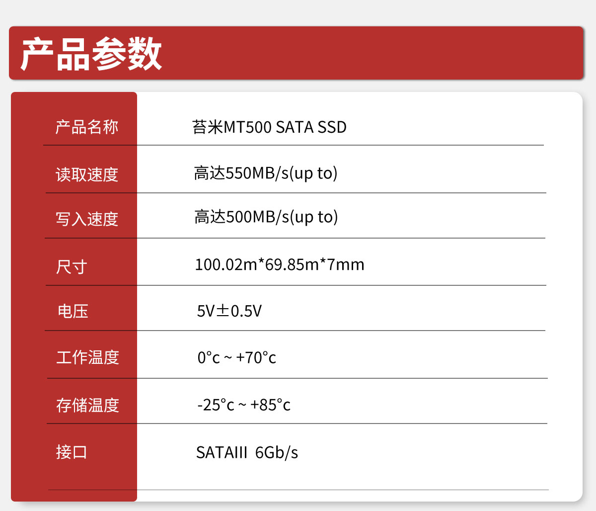产品遵循SATA 3.0标准,支持128GB~2TB容量段。可支持传输性能为R=550MB/s, W=500MB/s,采用优质3D NAND Flash存储芯片,性能持久稳定,静音低耗,兼容性强,品质优异,是消费类市场值得信任的一款产品。